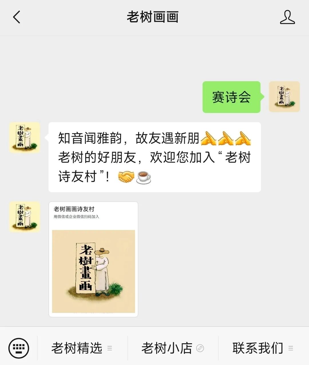 凭据我方对主题画作的相识,在“老树诗友村”群内聊天发送我方所作的诗句,即可参与。加入“老树诗友村”: